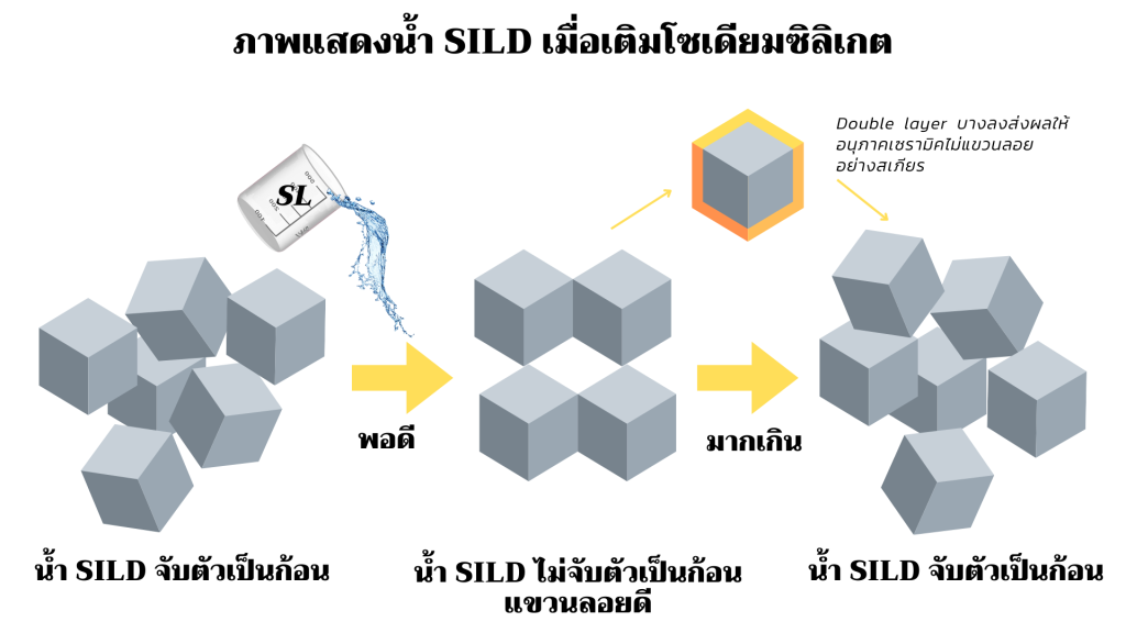 โซเดียมซิลิเกต ทำหน้าที่เป็นตัวทำให้น้ำ Slid ไม่เกาะตัวกันเป็นตะกอน (Defloculation) ทำให้น้ำ Slid ไหลได้ง่ายและเป็นตัวพาน้ำ Slid เข้าไปยังซอกเล็กๆของแม่พิมพ์ได้เป็นอย่างดี โซเดียมซิลิเกตถูกใช้เป็นสารลดแรงสั่นสะเทือนในการหล่อช่วยลดความหนืดและลดการใช้น้ำปริมาณมากเพื่อทำให้เนื้อดินเหลว นอกจากนี้ยังใช้เพื่อสร้างเอฟเฟกต์รอยแตกร้าวในเครื่องปั้นดินเผาและช่วยในการทรงตัว